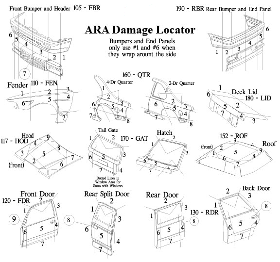 Pictured below is what is most commonly referred to as a Damage Code Locator which is provided to recyclers by the Automotive Recyclers Association. The Damage Code Locator is extremely useful for identifying specific damage locations on parts.